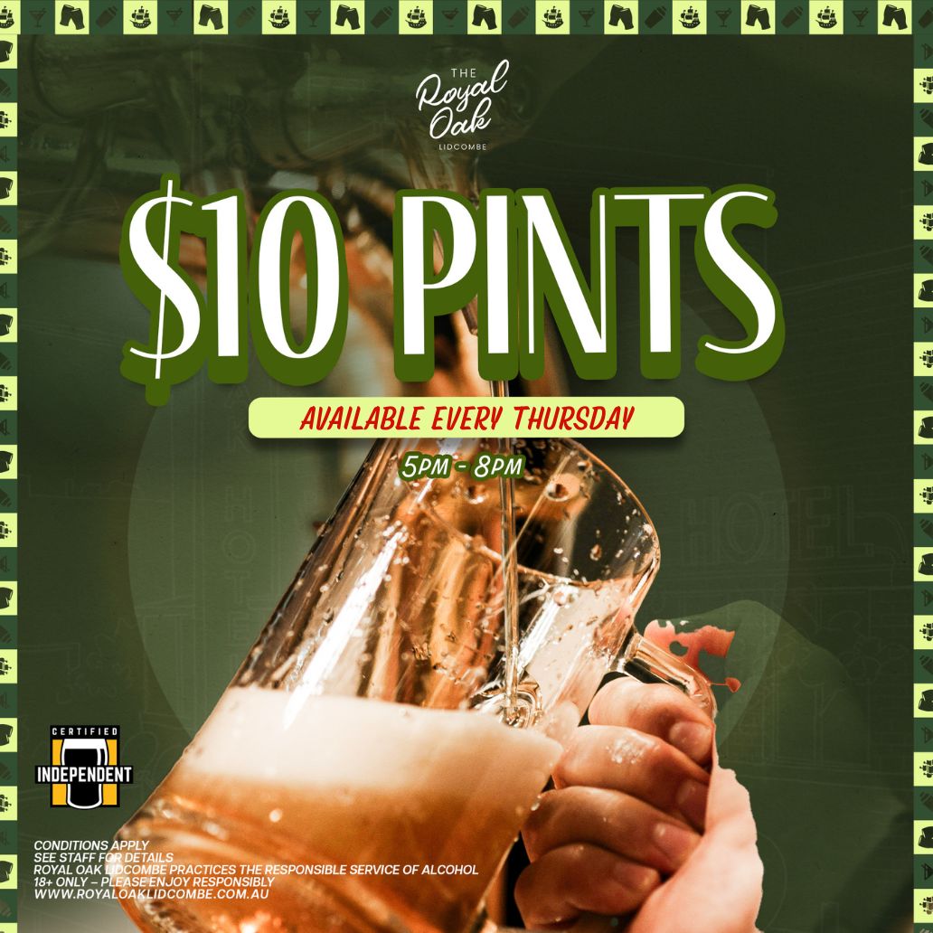 Head in every Thursday between 5pm and 8pm for $10 pints at The Royal Oak Lidcombe. Available on selected beers and tap favourites.